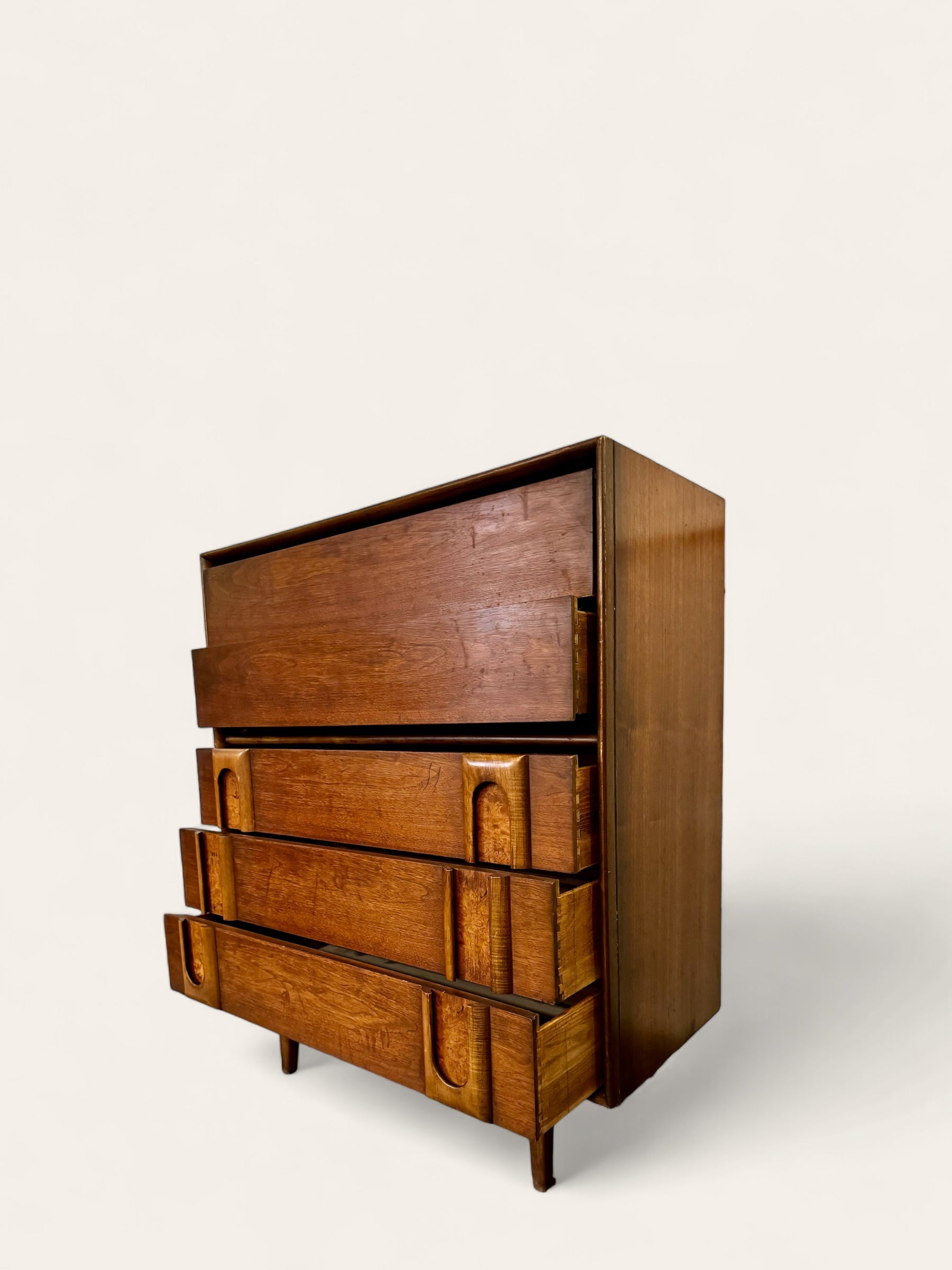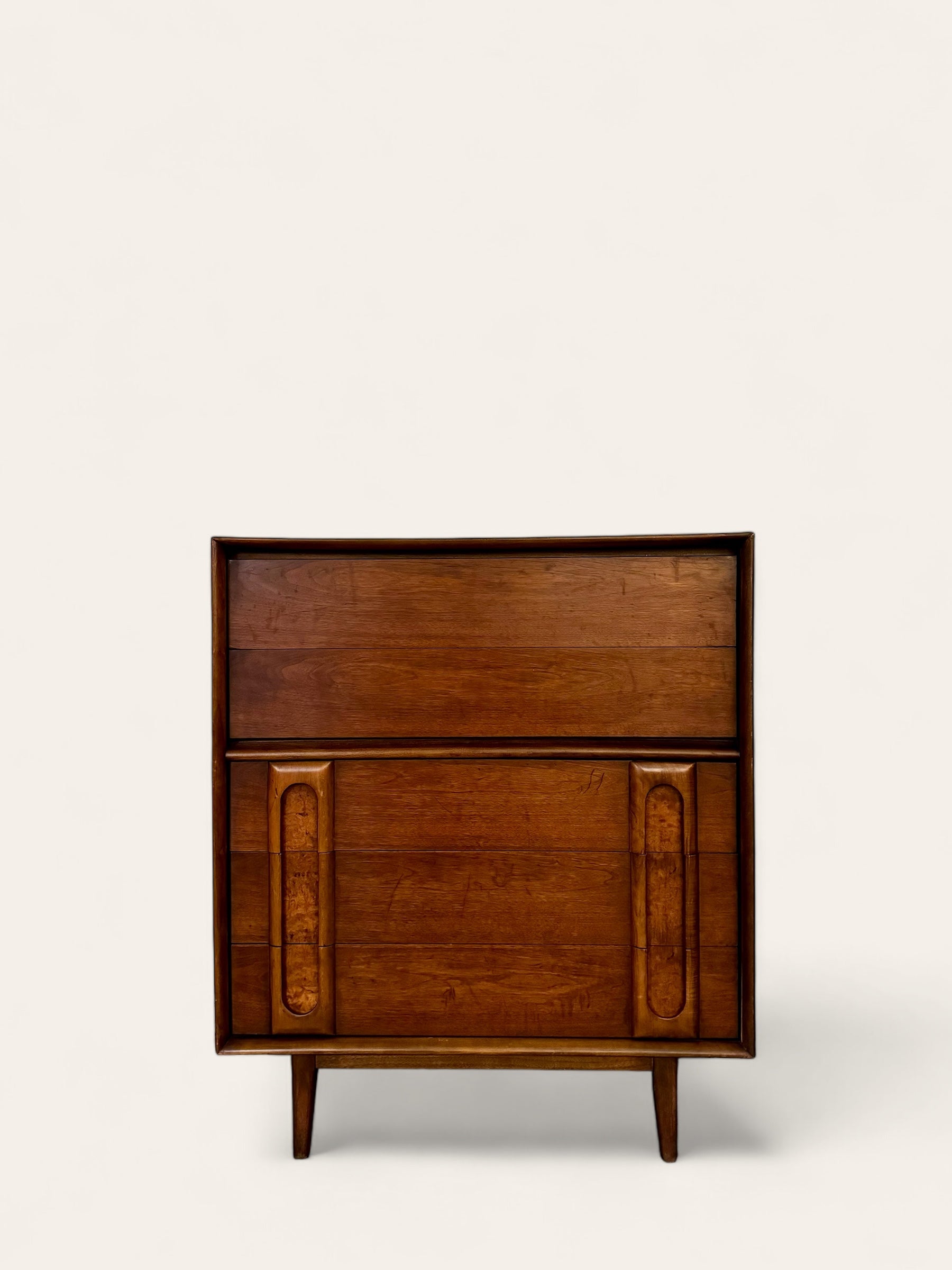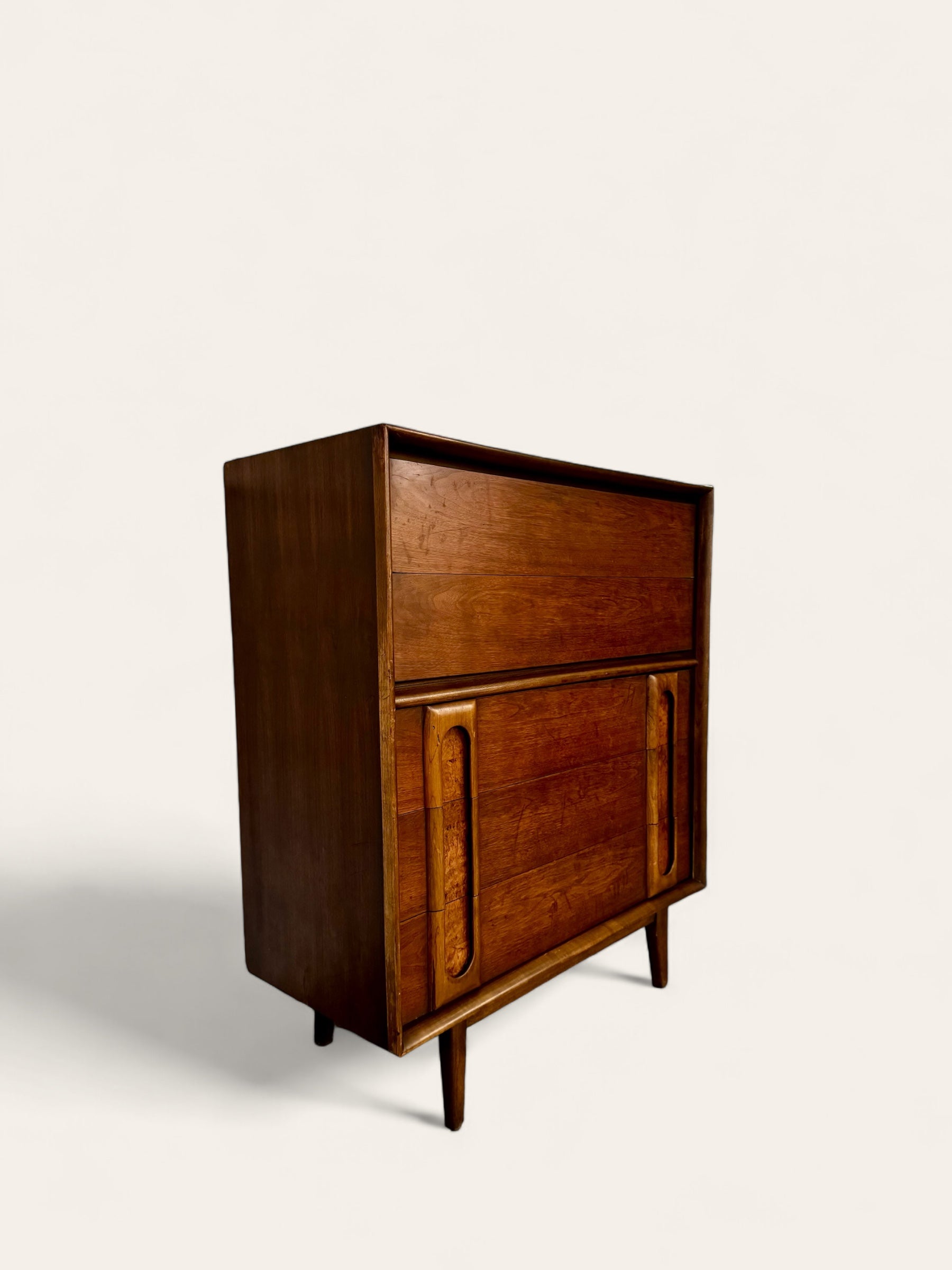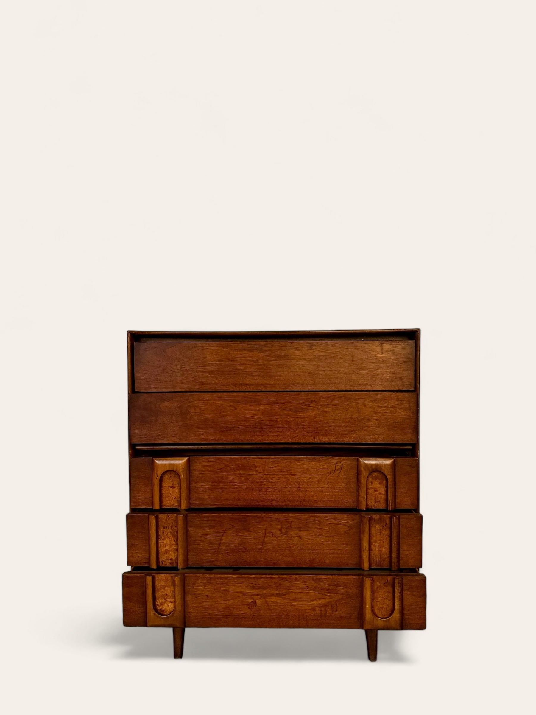 1960s MCM Vintage Lane Burlwood + Walnut 5 Drawer Tallboy Dresser