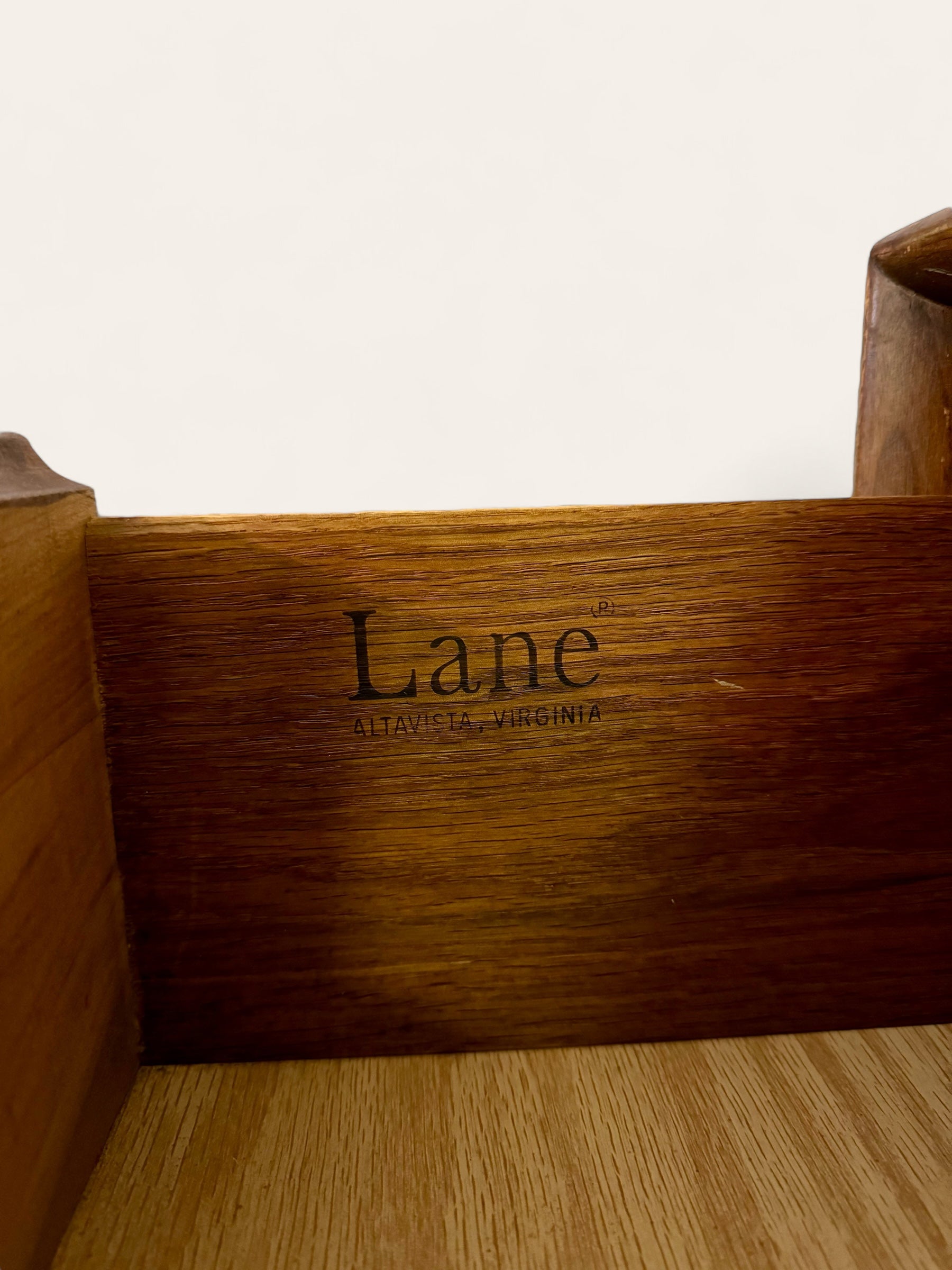 Lane got it right with this one, folks! This stunning 5-drawer tallboy made of walnut and burlwood is in original vintage condition with character marks throughout. The patina on this one is just how like it! Hidden pulls give this piece a real sleek look. Nice work, Lane!