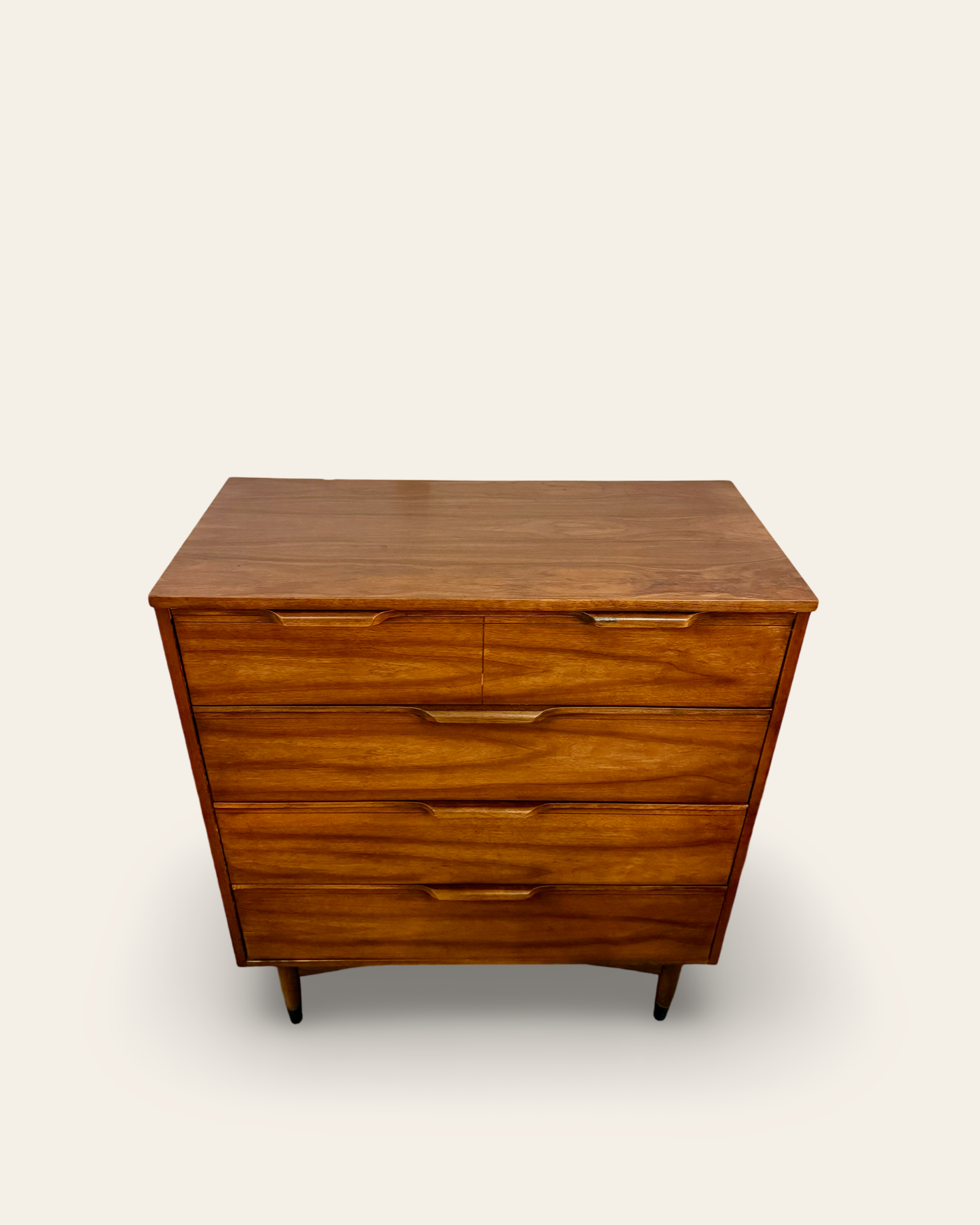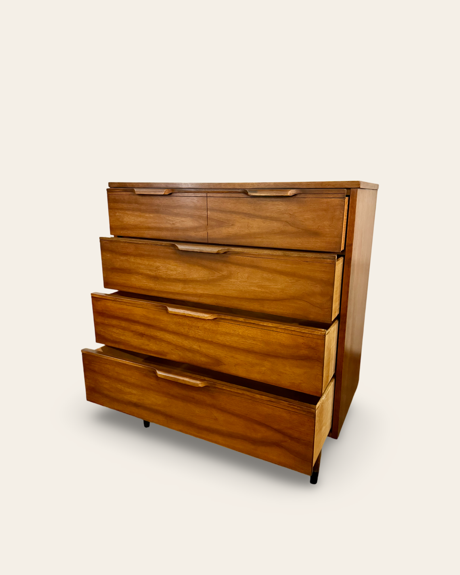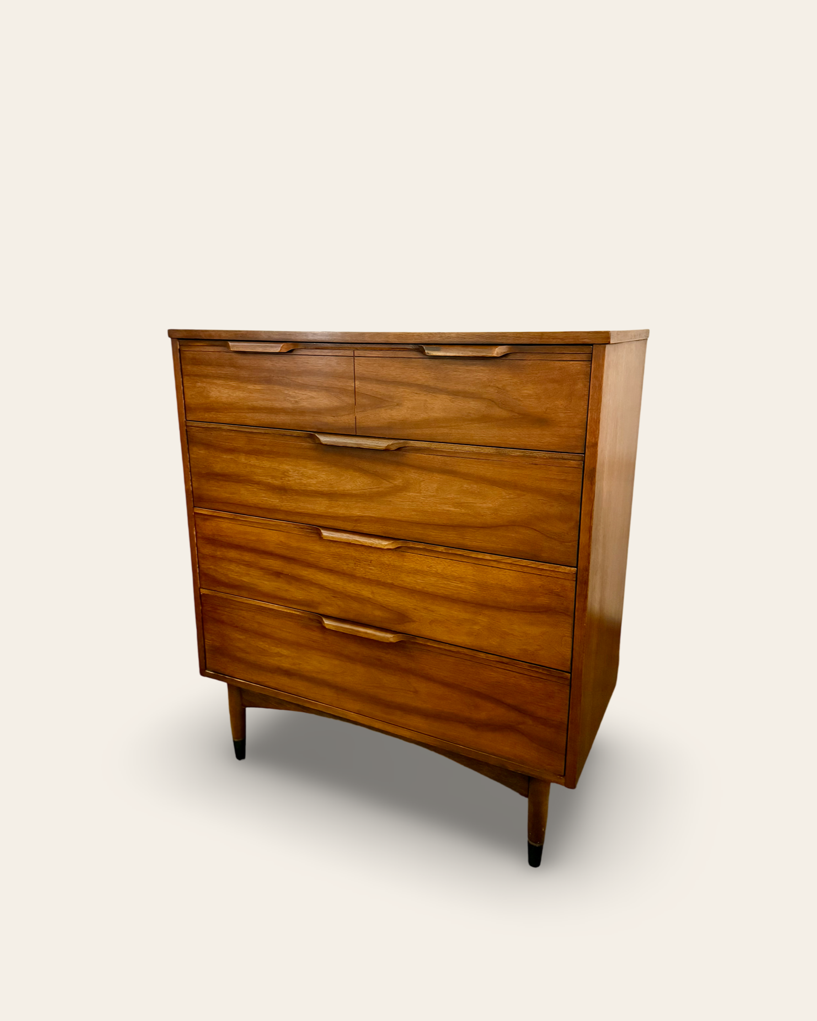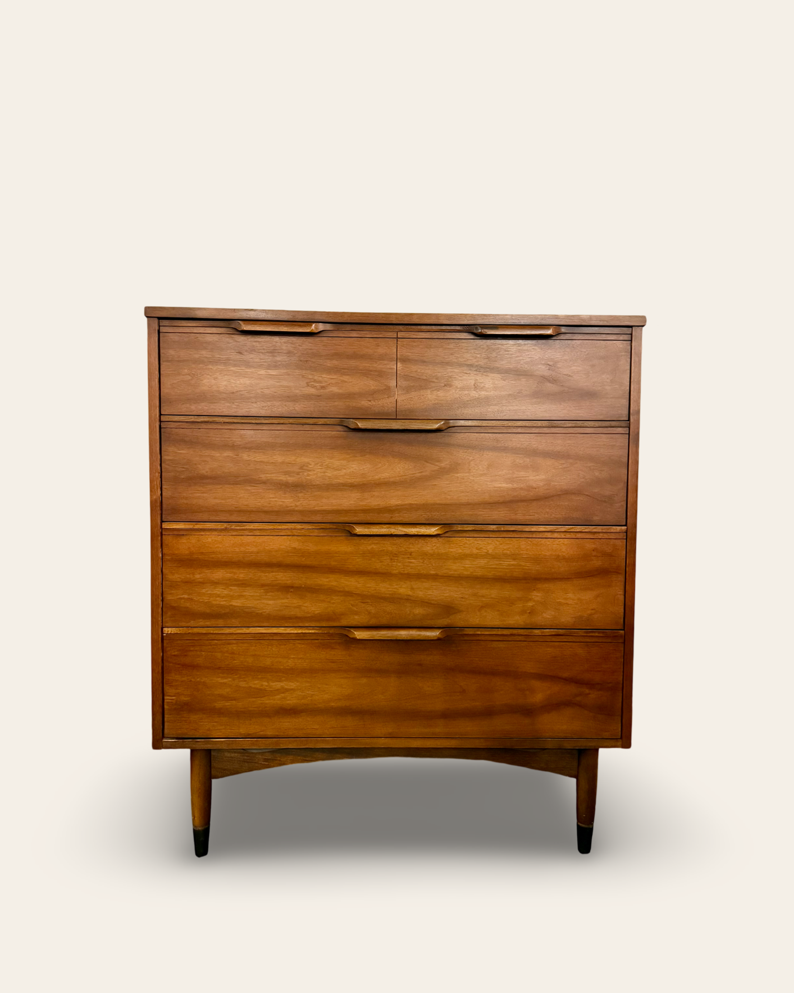 A beautiful mid-century modern walnut tallboy four drawer dresser with sculpted drawer pulls, dovetail construction, and classic MCM tapered legs. All four drawers pull smoothly and the overall original condition of this 1960s dresser is solid with minor wear and tear throughout. This one’s a stunner!