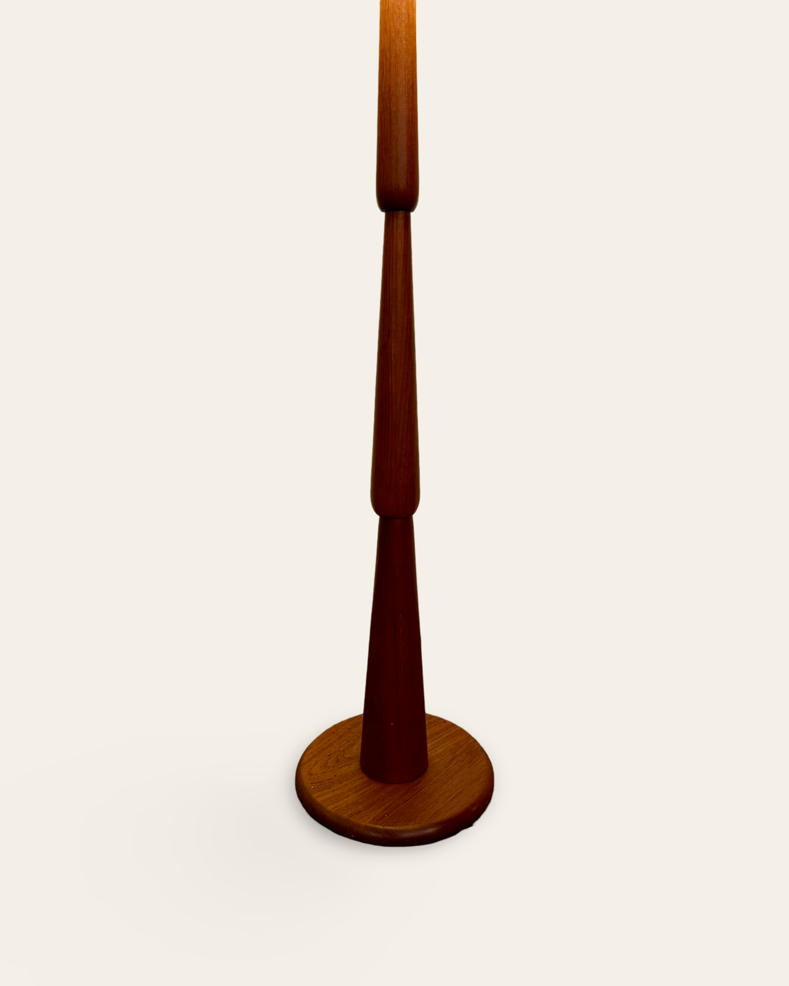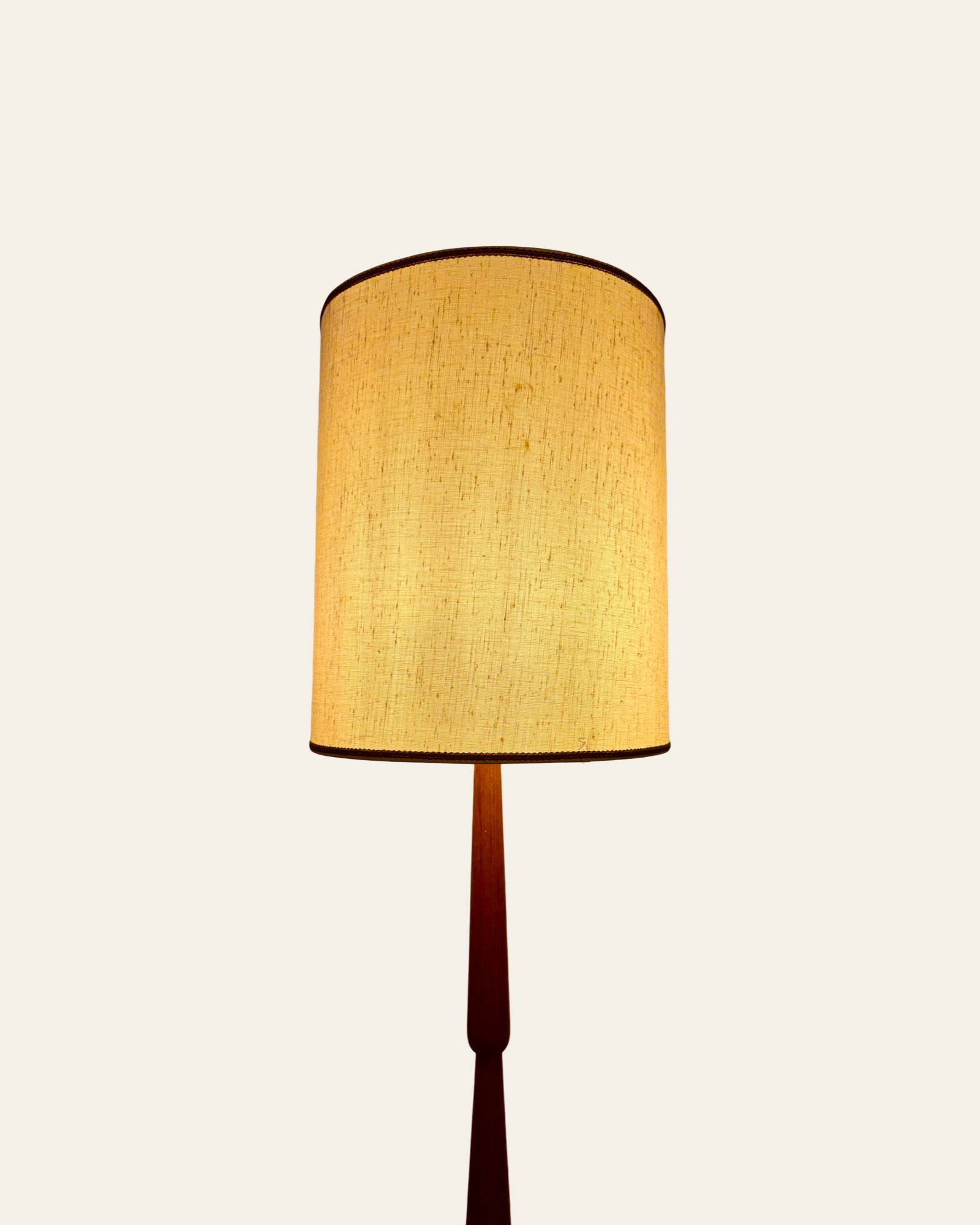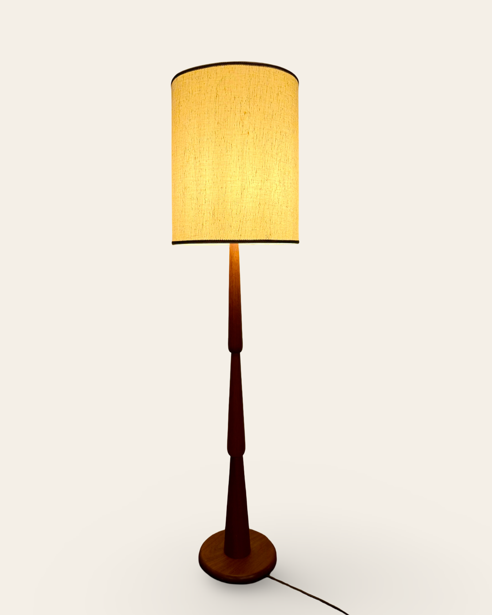 This solid teak floor lamp from the 1960s is a striking example of Nordic design, featuring a sculptural base made from stacked, tapered cones. It’s been paired with a new, textured natural fiber shade that complements the lamp’s organic character. Overall, it’s in excellent condition and brings a warm, vintage presence to a room without demanding too much attention.