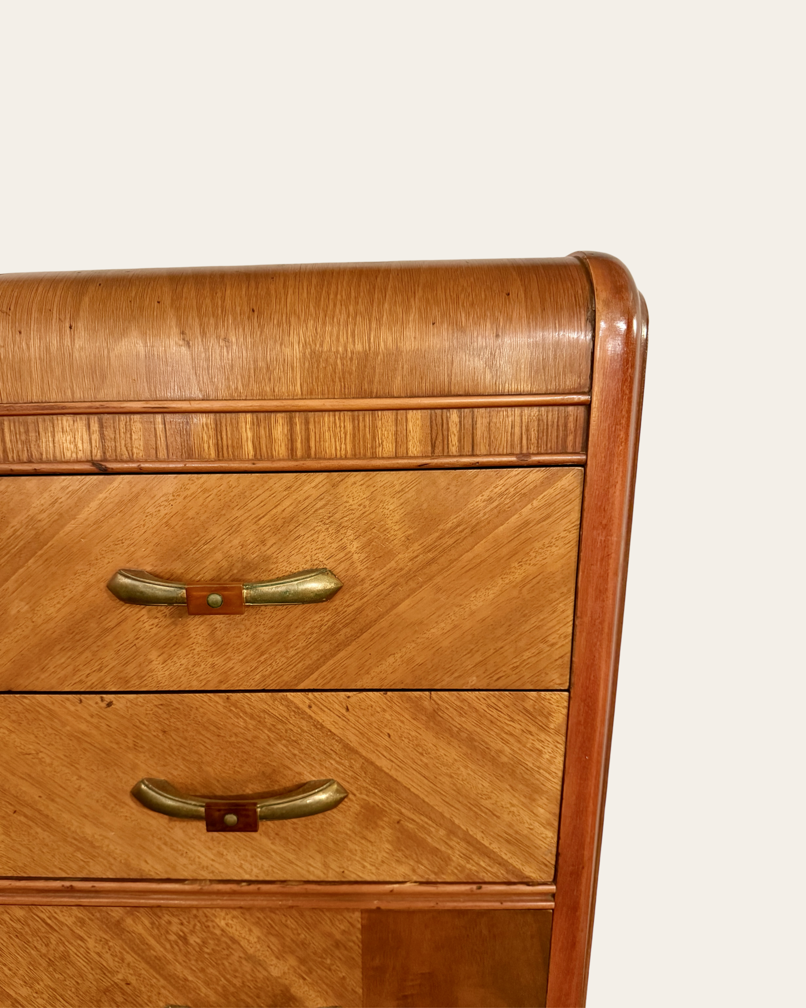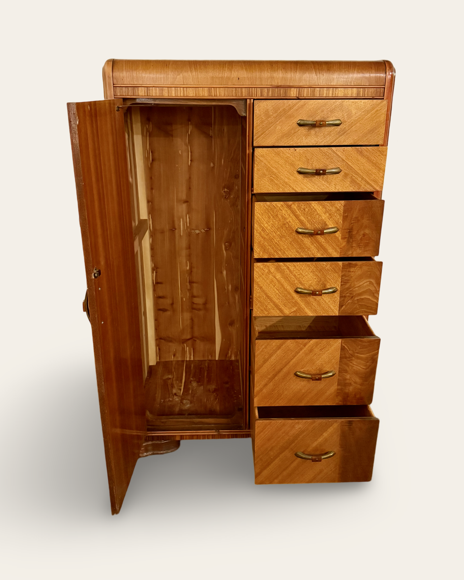 This Art Deco waterfall wardrobe is both functional and gorgeous. With 6 drawers and a full closet, this chifforobe offers a lot of storage. The original Bakelite pulls are in great original condition as well. Save $100 by purchasing the matching lowboy dresser!