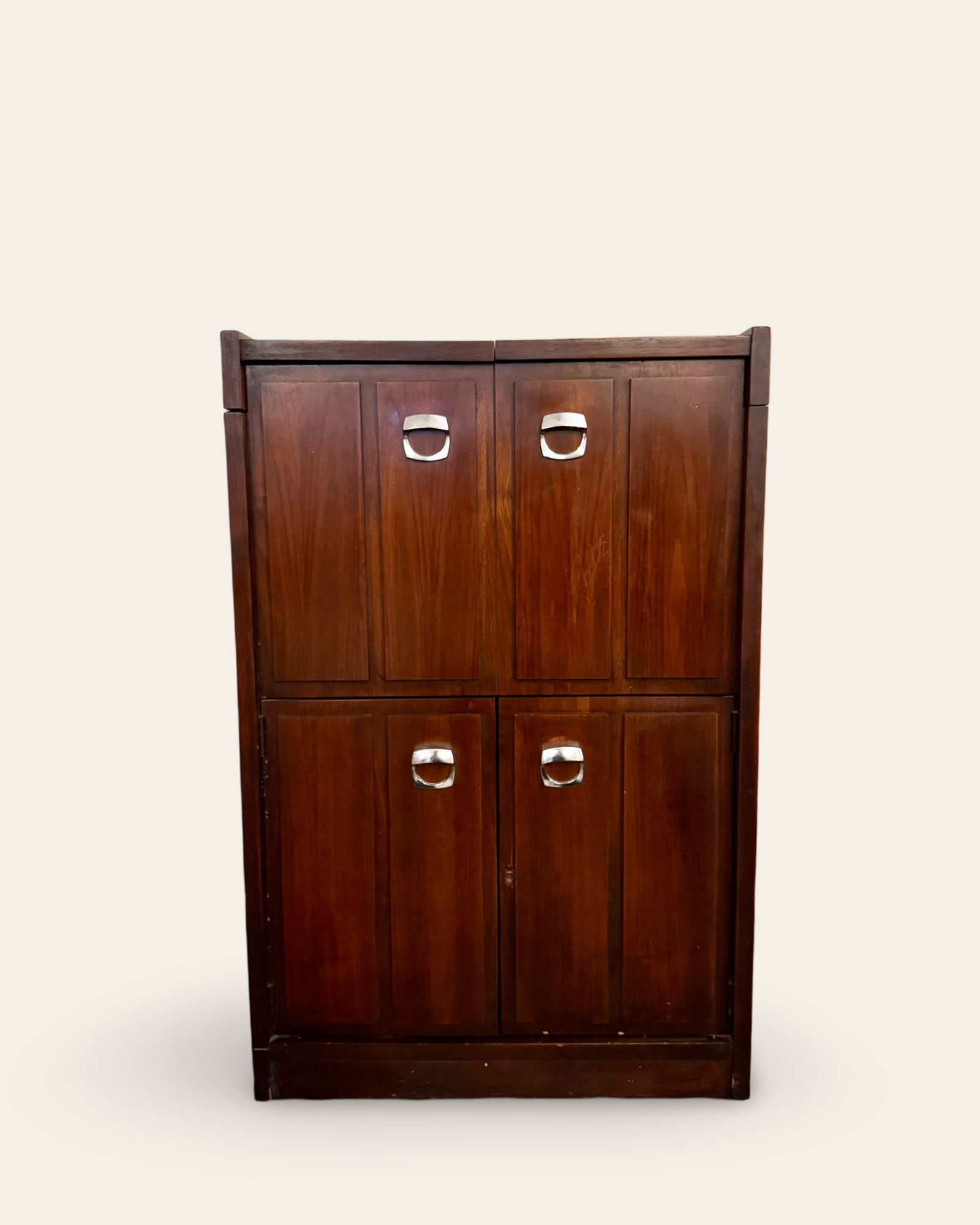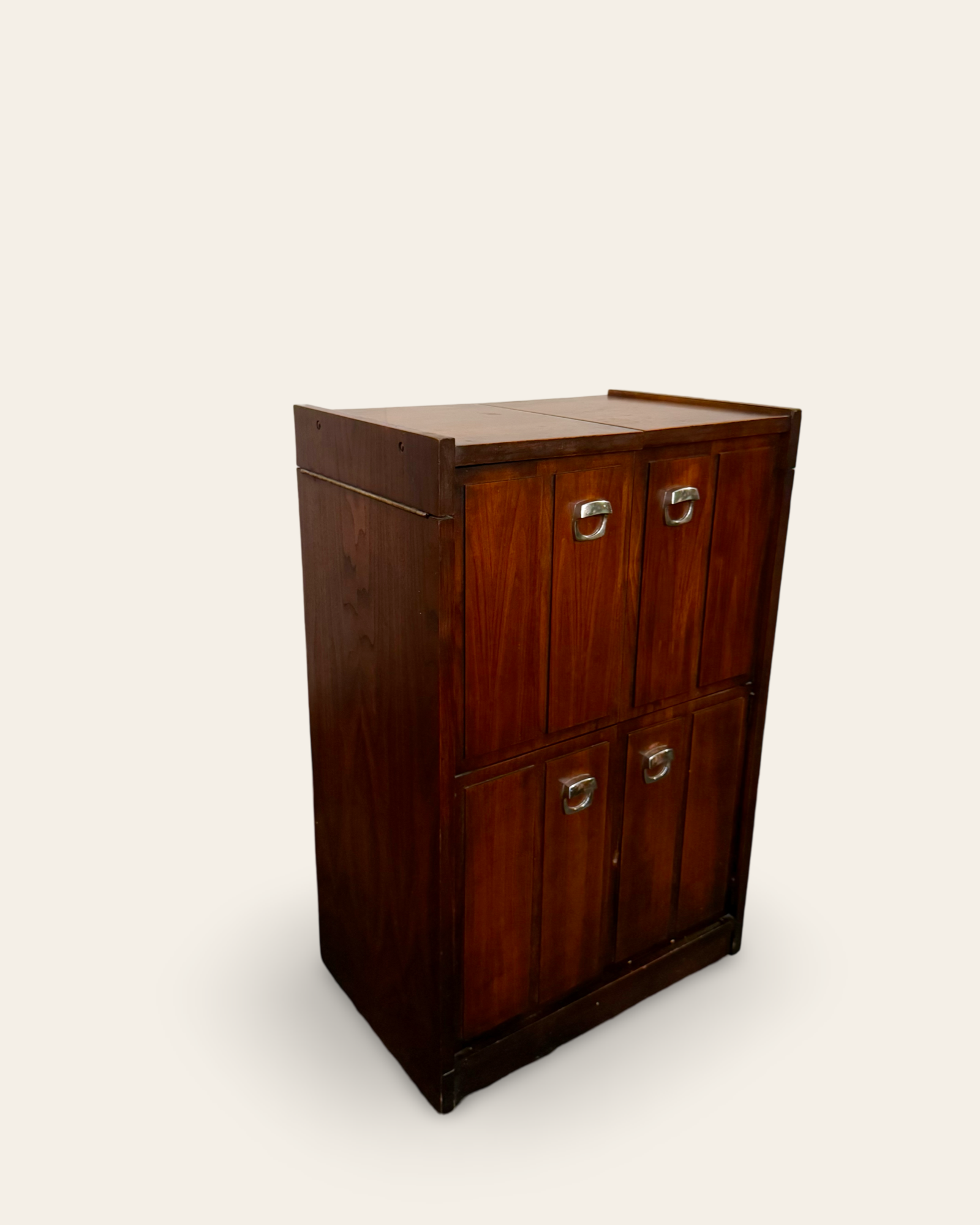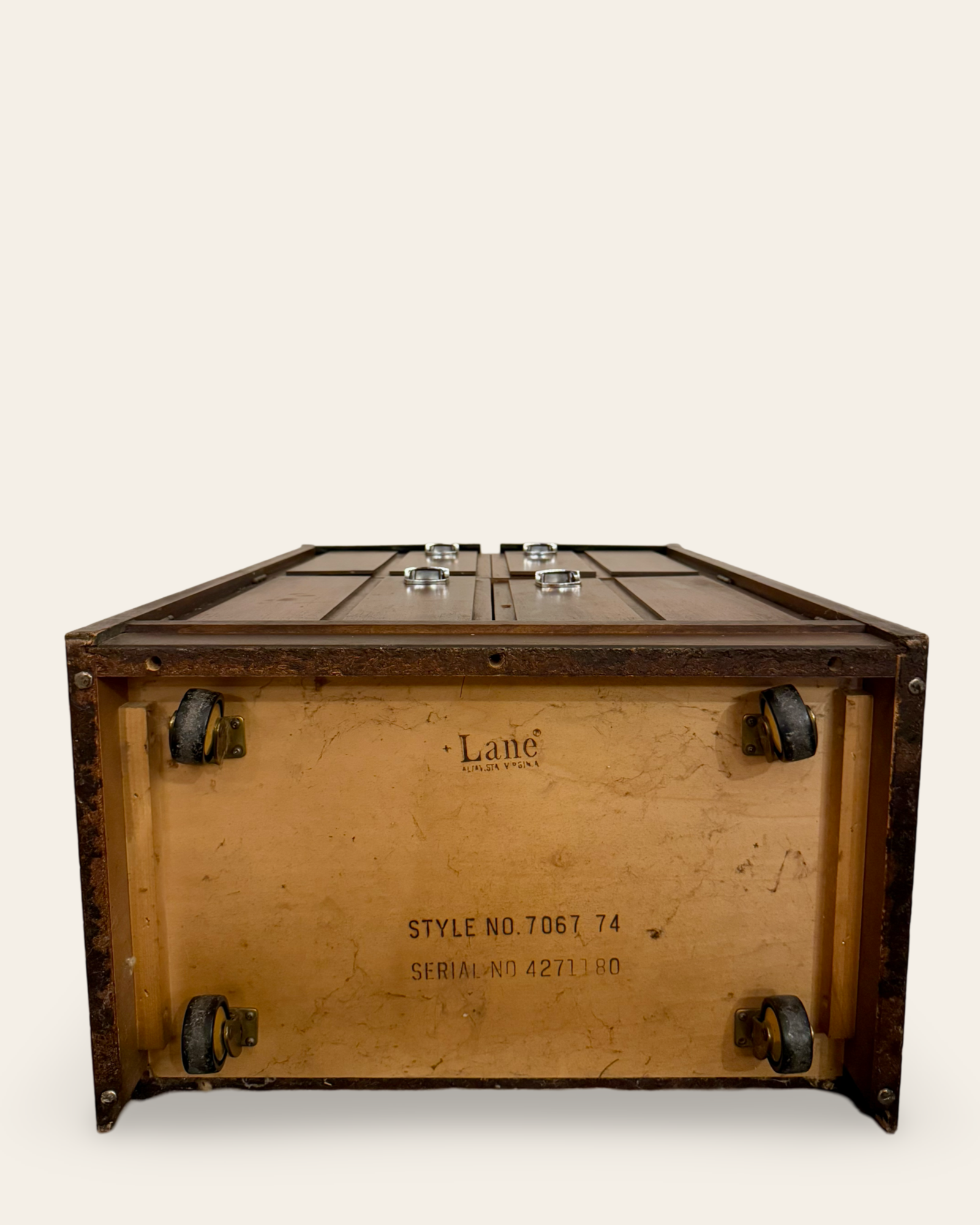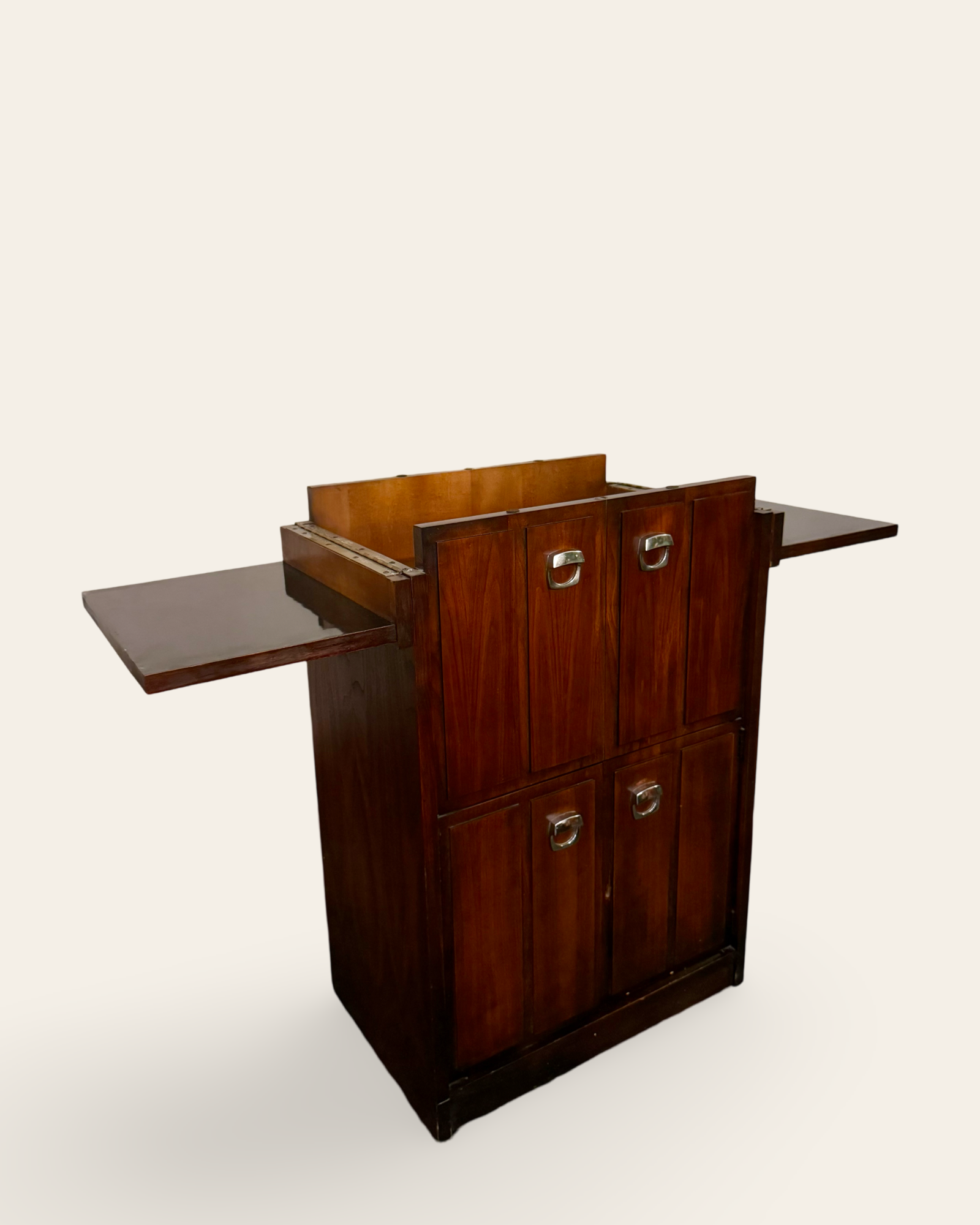 Beautiful vintage Lane dry bar with storage underneath. The original pulls and original dark stain are in great condition. It’s compact size makes it especially appealing for smaller spaces.