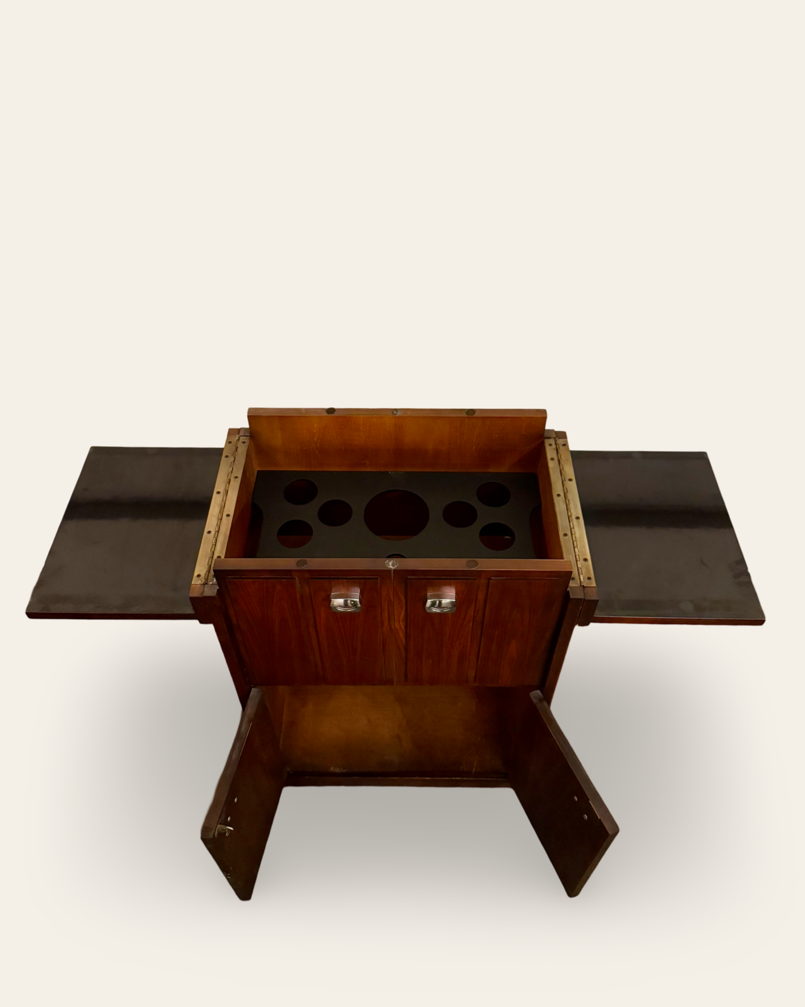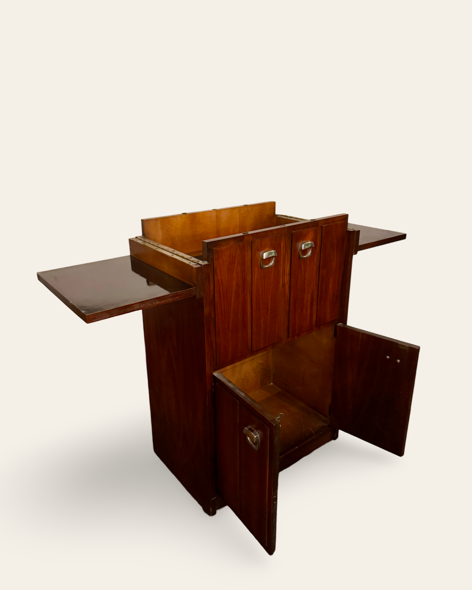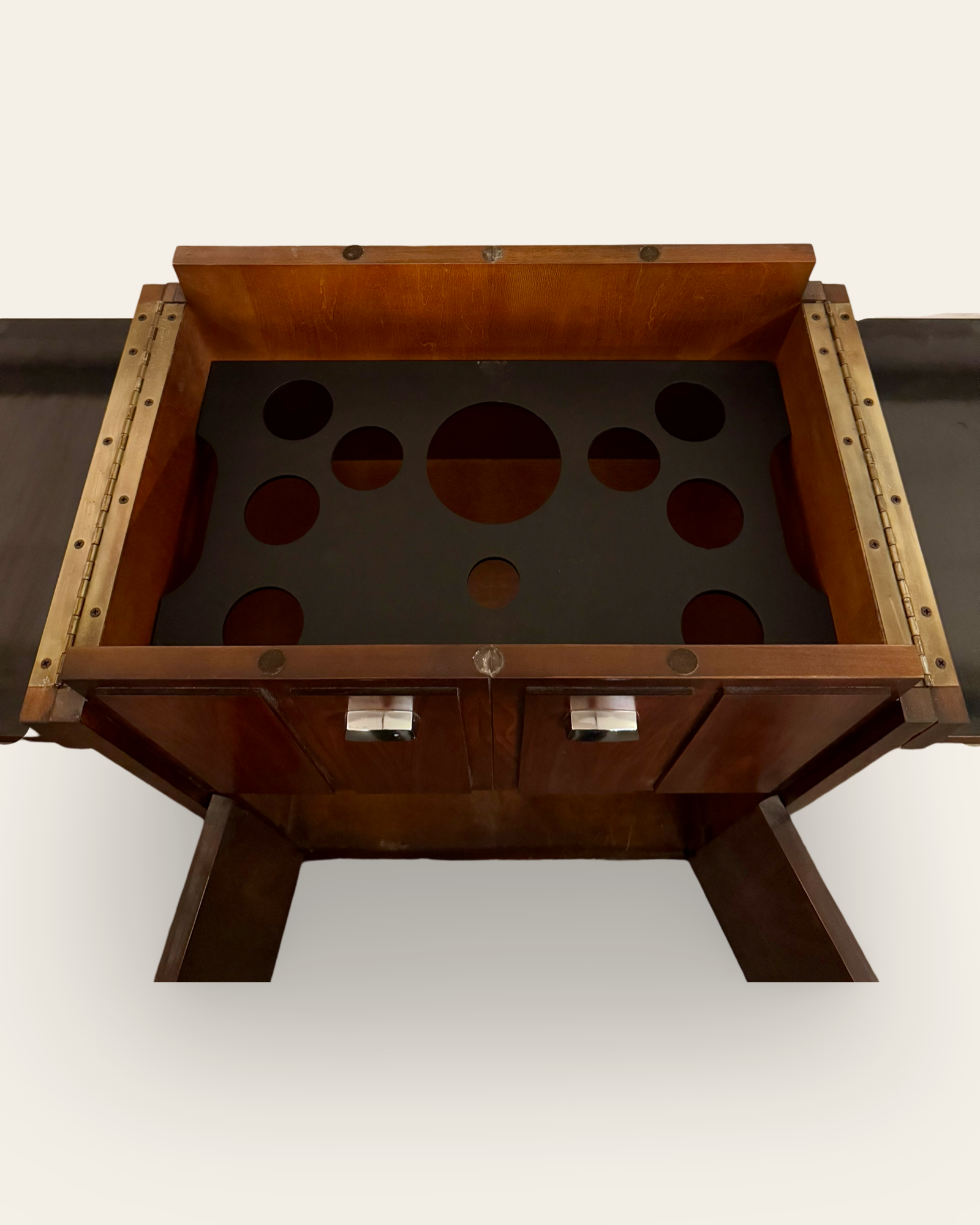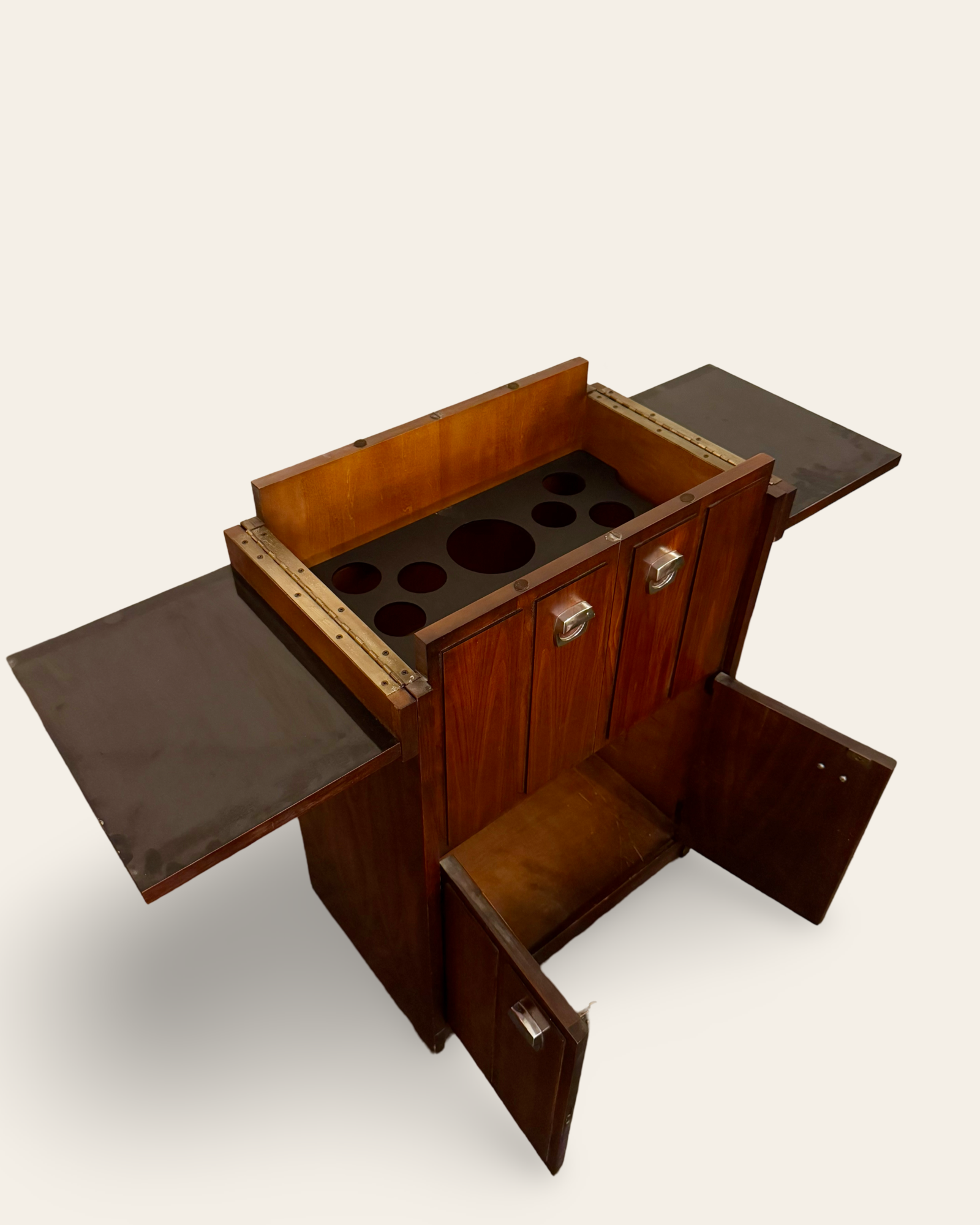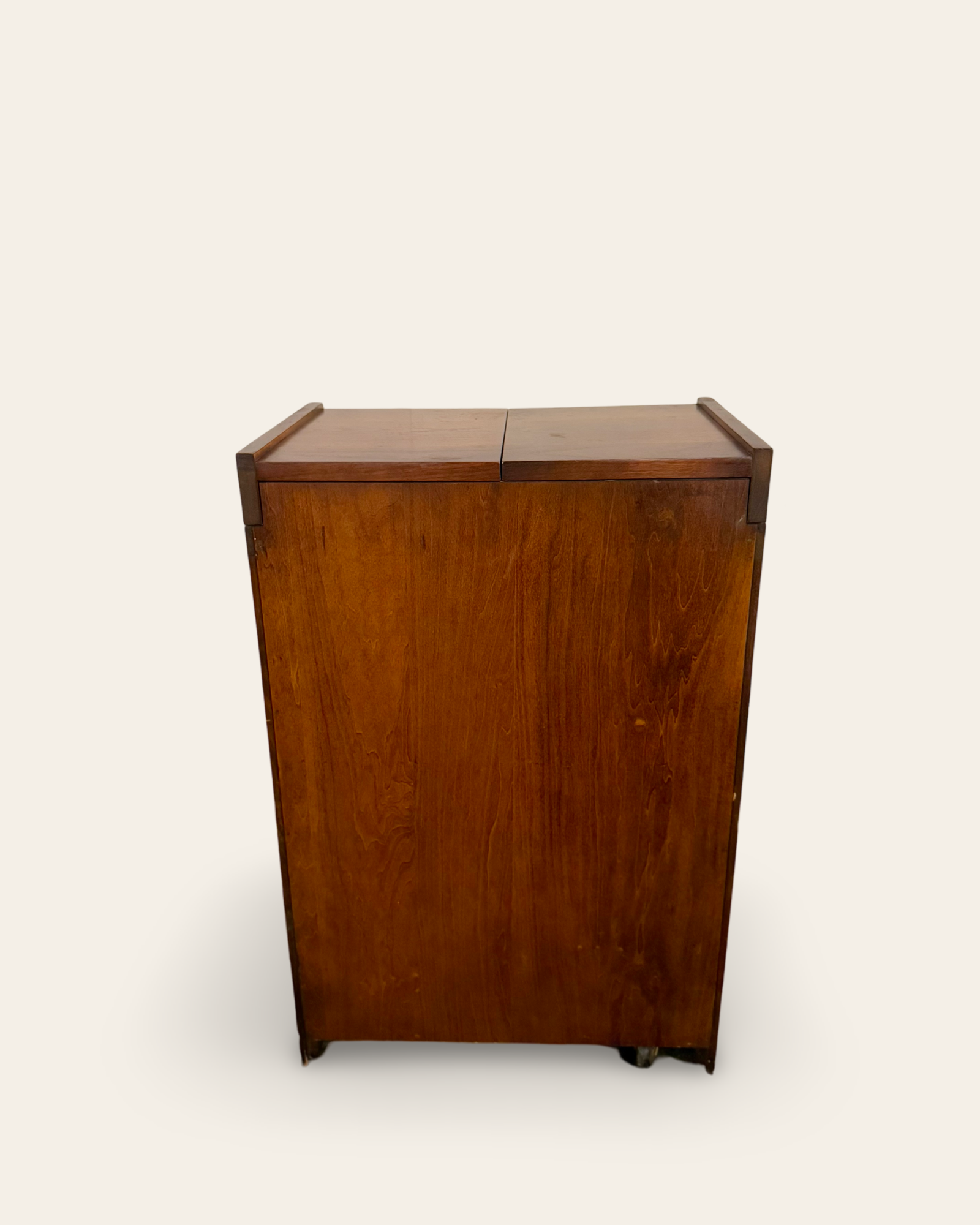 Beautiful vintage Lane dry bar with storage underneath. The original pulls and original dark stain are in great condition. It’s compact size makes it especially appealing for smaller spaces.