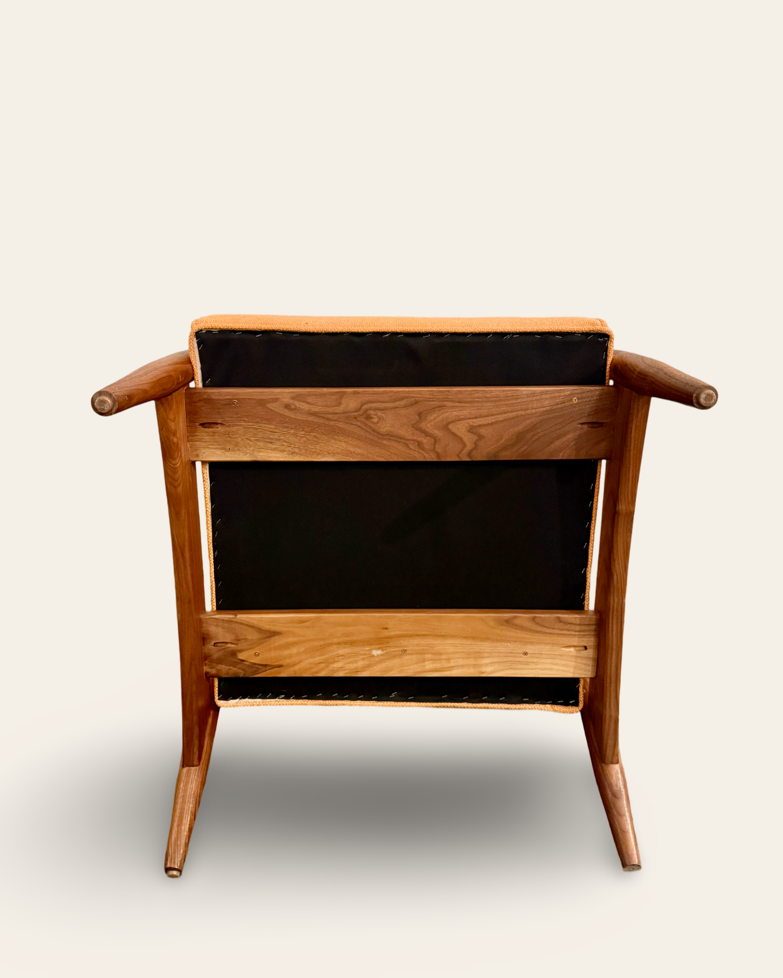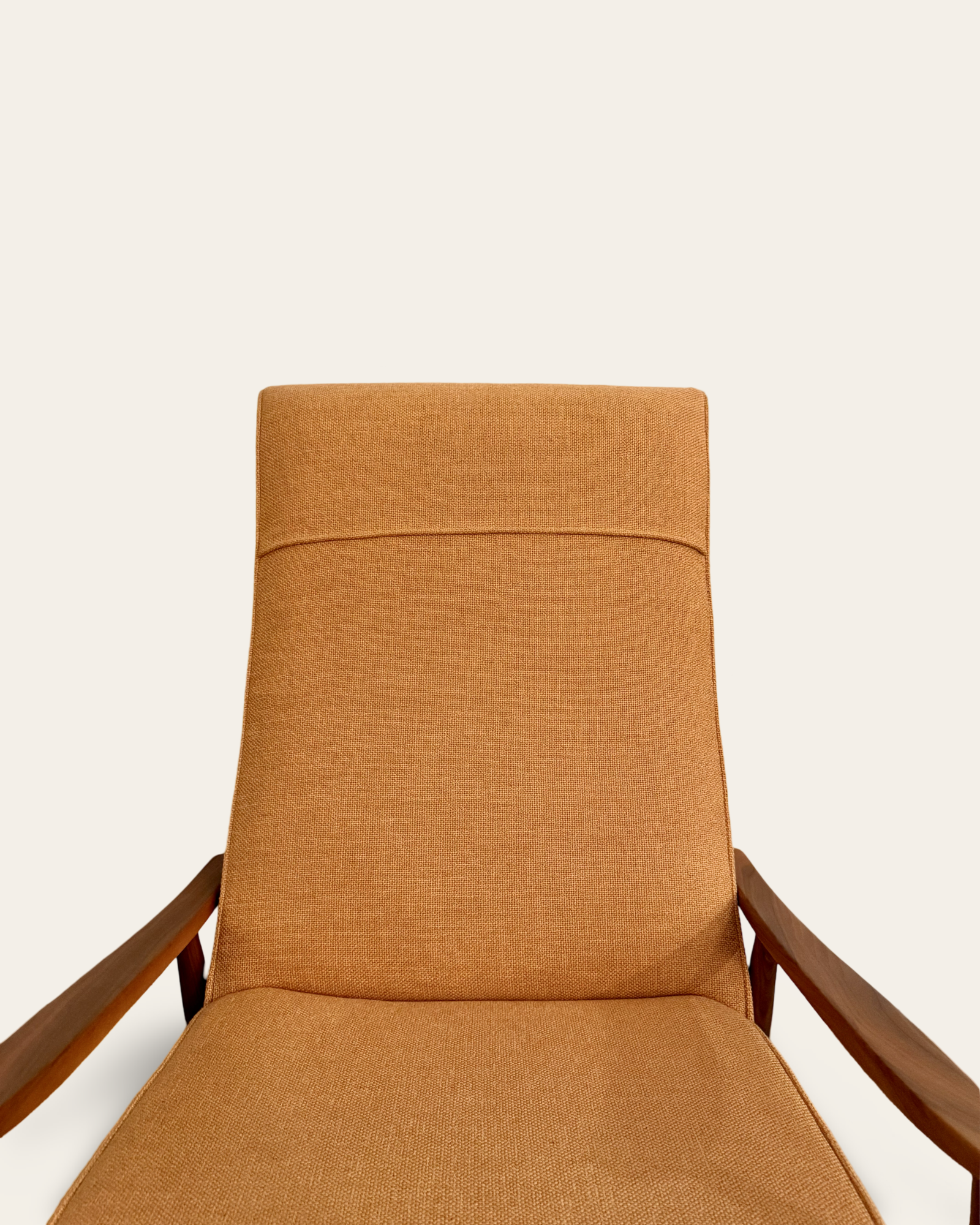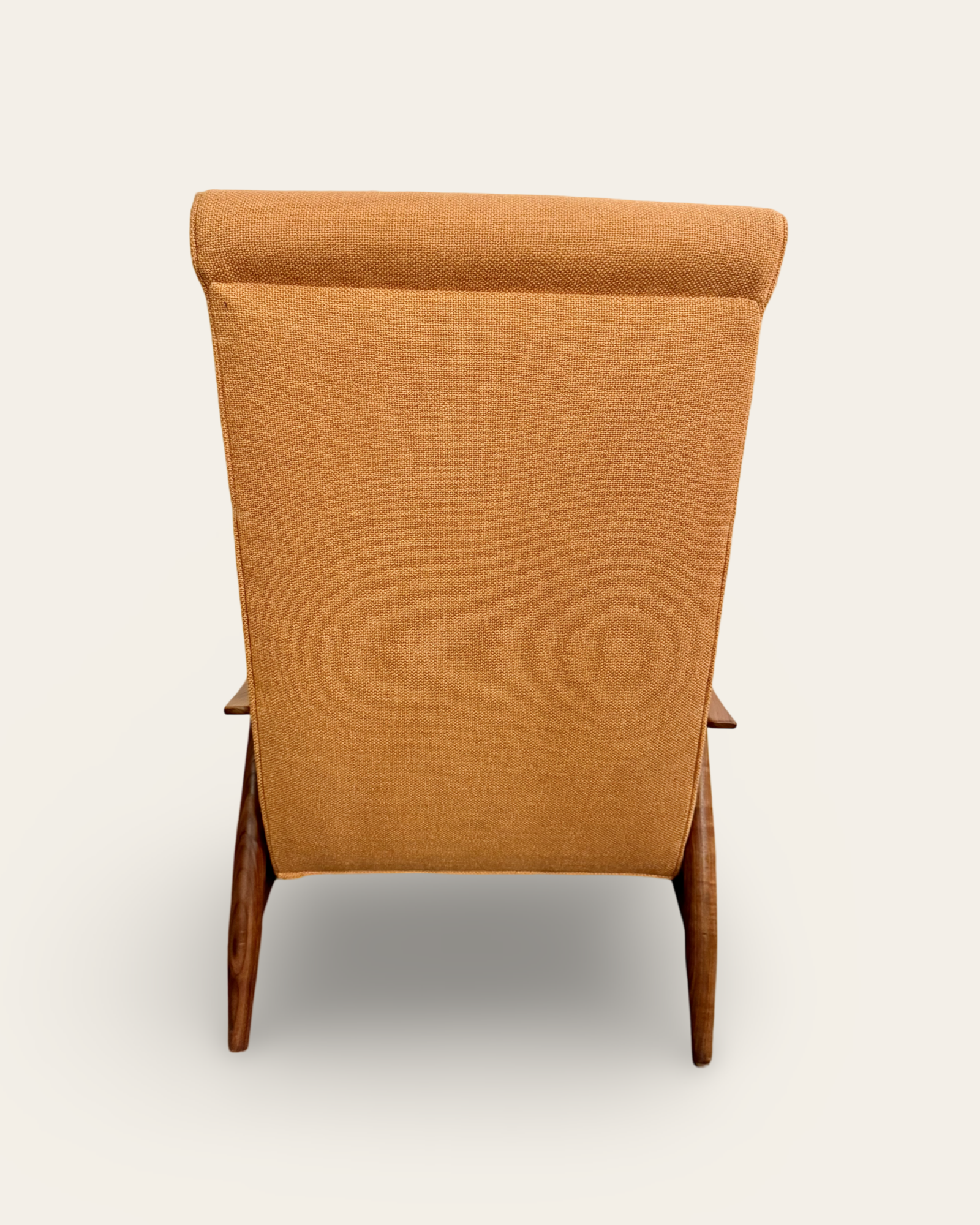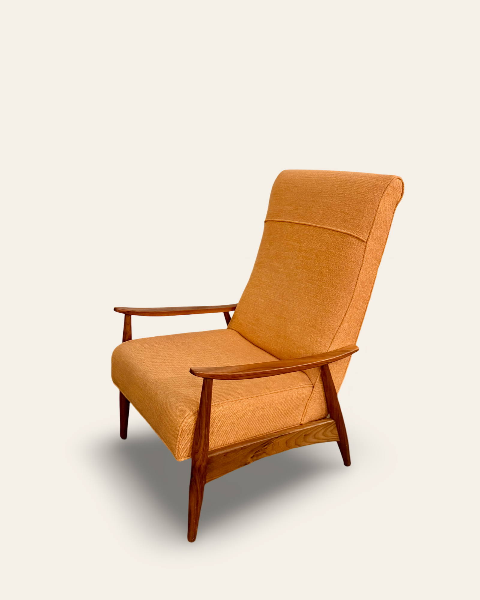 This beautiful orange upholstered tall back lounge chair has been celebrated for years! This classic design is most known for being a recliner, however, it’s my understanding they were also made to be stationary and as rockers. This one is in excellent condition and is super comfortable. The walnut frame is near perfect and the upholstery is in fantastic shape with zero tears, stains, or rips. A real gem of chair!