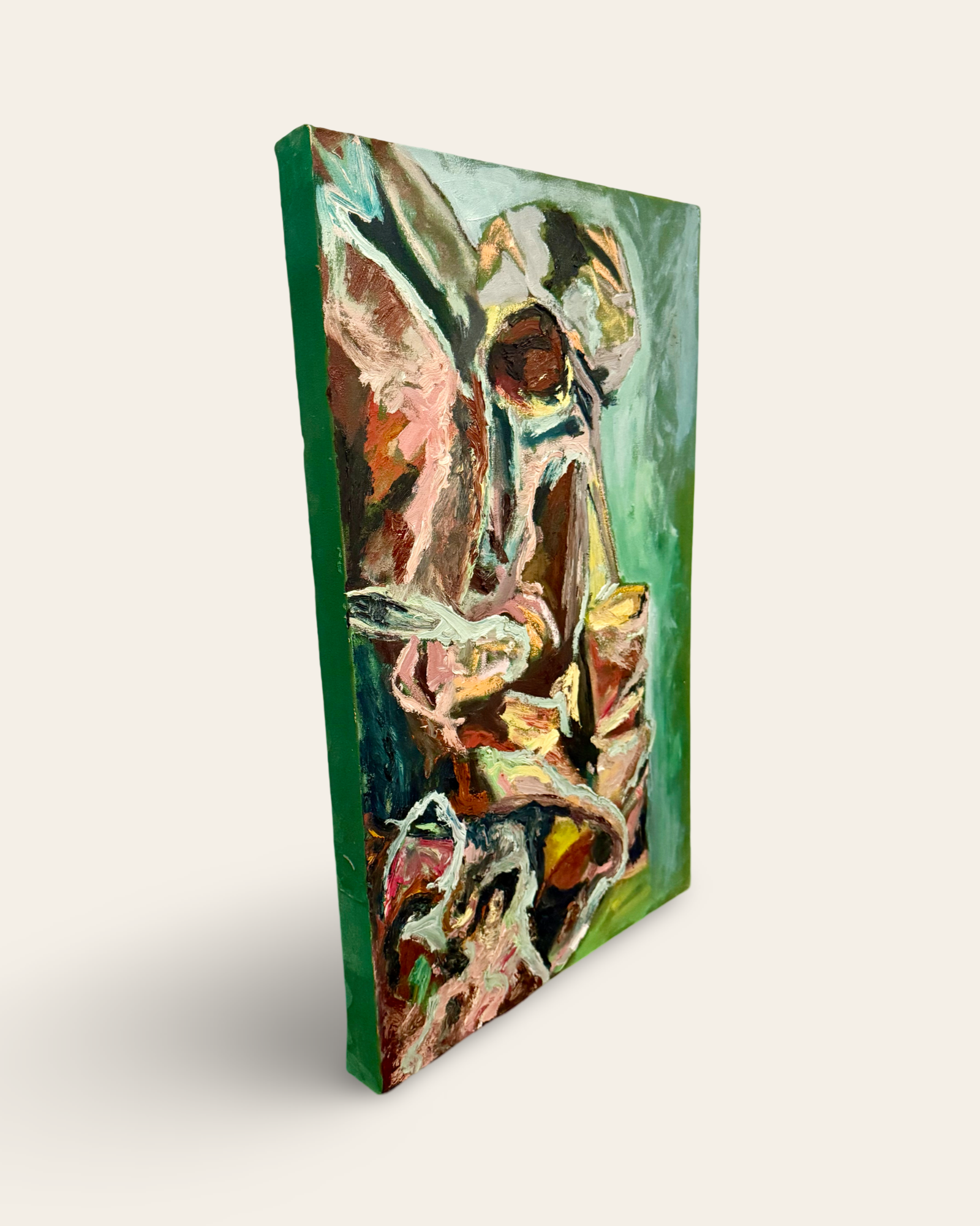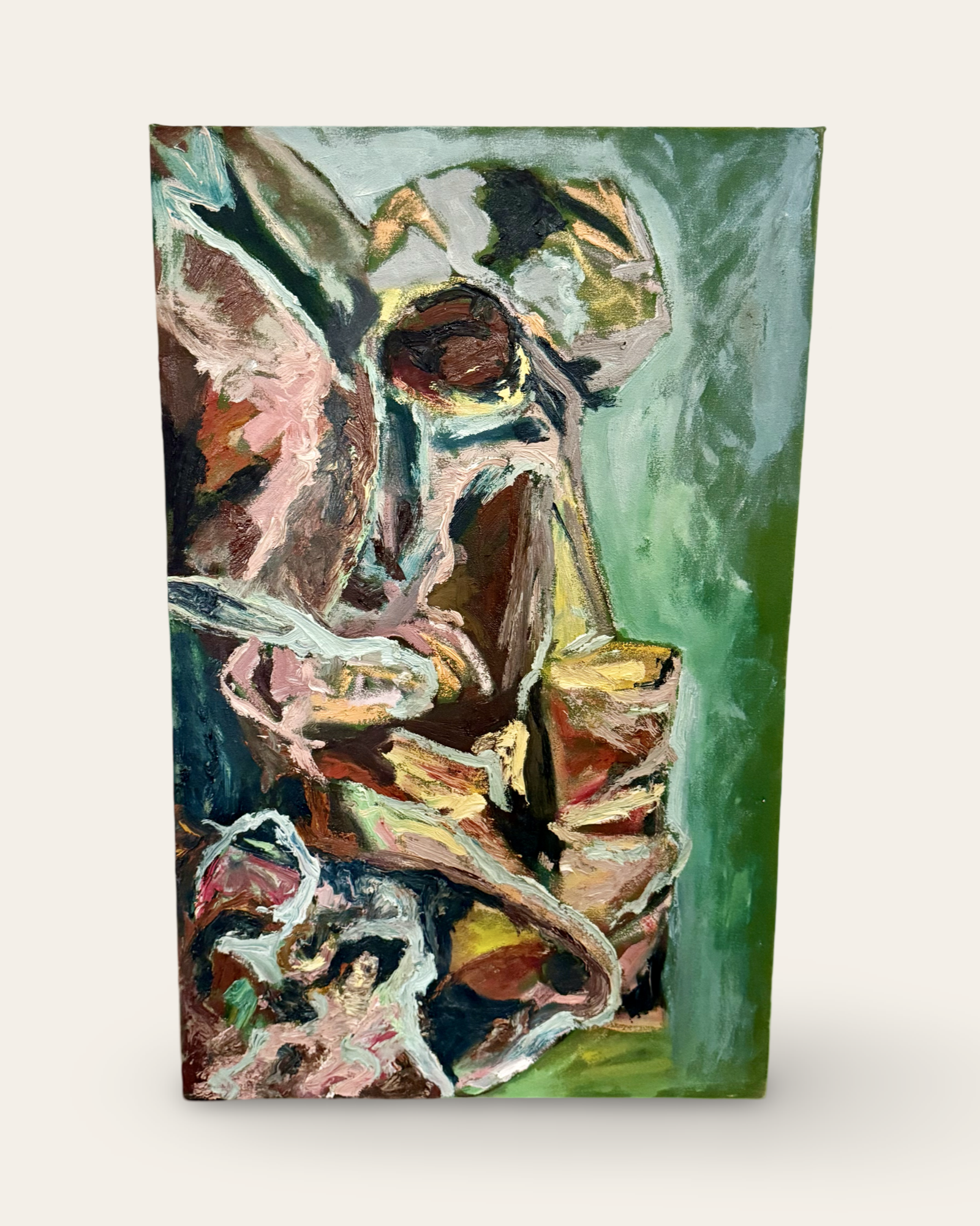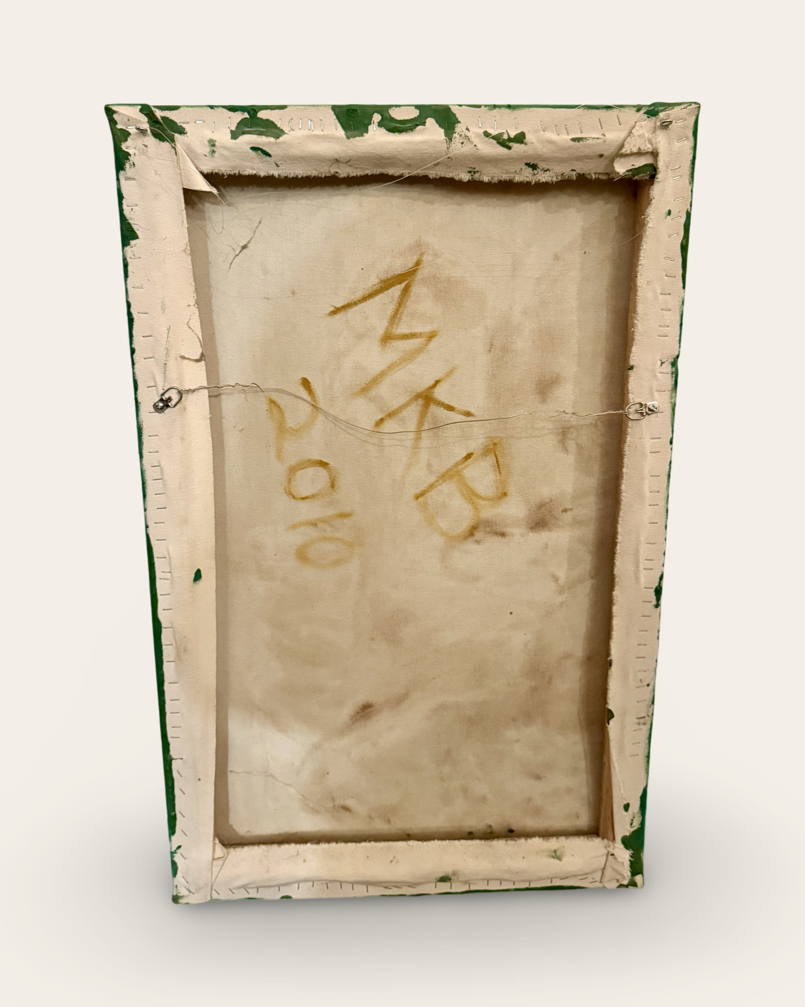 I love the color palette used in this original oil painting. The abstract design allows for various interpretations. The back of the stretched canvas reads "MKB 2010". Fun piece!