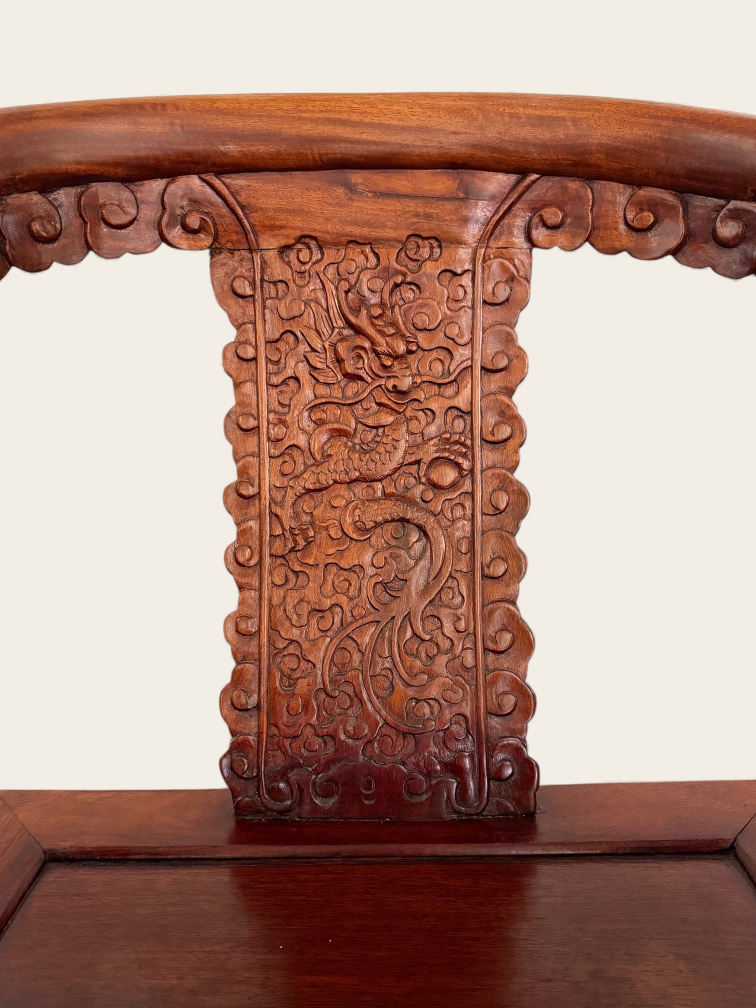 Pair of finely carved Vintage Chinese Hongmu hardwood dragon armchairs, beautifully sculpted with traditional dragon motif arms and a detailed carved back panel. Each chair features a raised square seat, boldly carved apron with cloud and ruyi patterns, and stylized legs reflecting classical Chinese design.