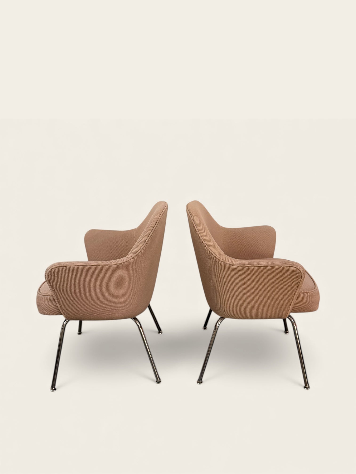 This is a 1960s pair of Executive Armchairs, Model 68, designed by Eero Saarinen for Knoll. The price includes the pair. They feature the classic Saarinen silhouette with sculpted arms, a generous seat, and chromed tubular steel legs. This pair retains its original beige textured upholstery, giving them a warm, neutral look that works beautifully in any space. They are in excellent original vintage condition with only light, age-appropriate wear. A timeless and highly collectible set from one of Knoll’s most iconic designs.