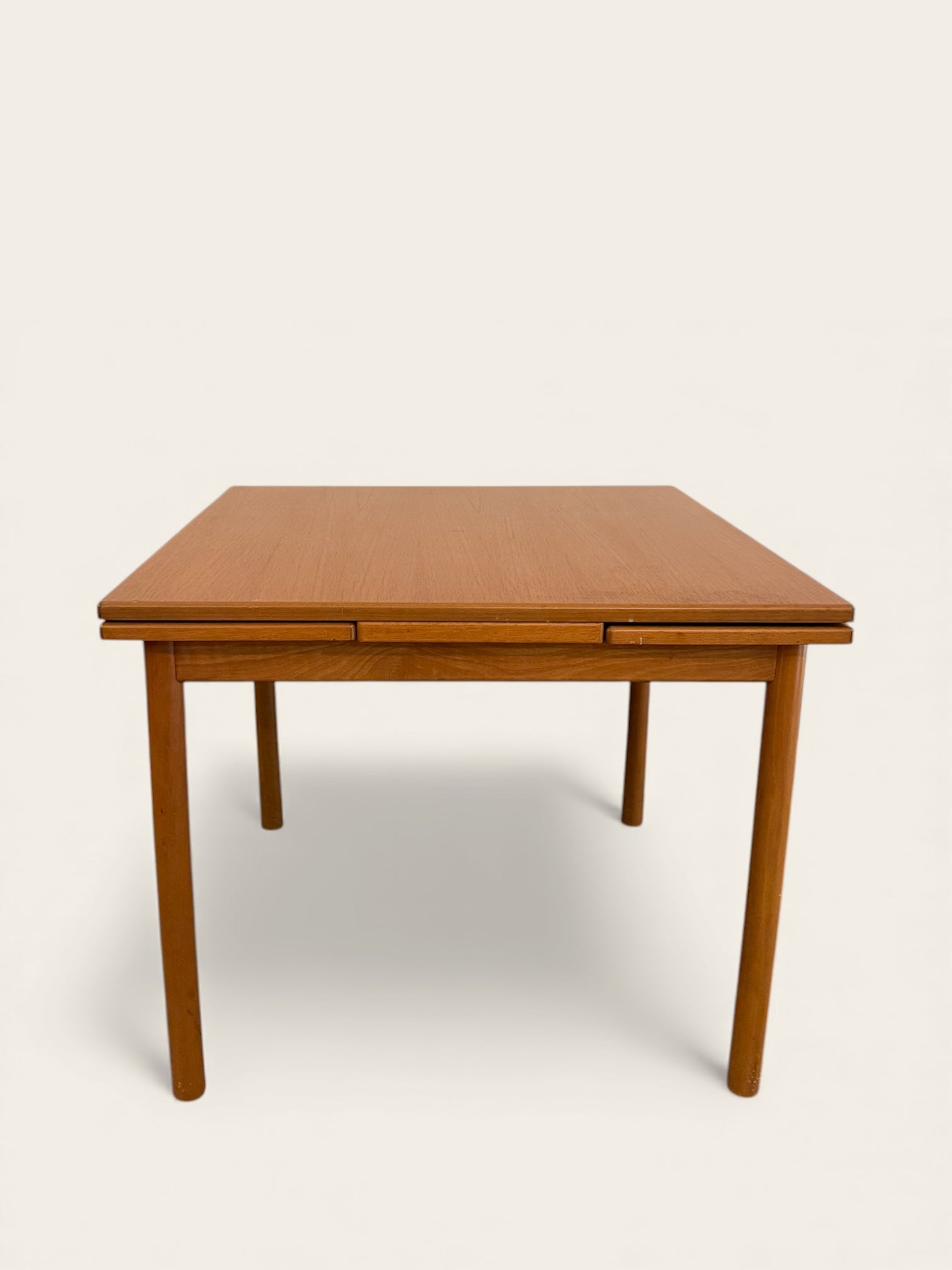 A classic vintage mid-century teak dining table with clean lines, a warm finish, and a smart, functional design. The slide-out leaves make it easy to go from everyday meals to larger gatherings, and the simple silhouette keeps it feeling timeless. Solid, well-made, and quietly elegant — the kind of piece that just fits, wherever you put it.